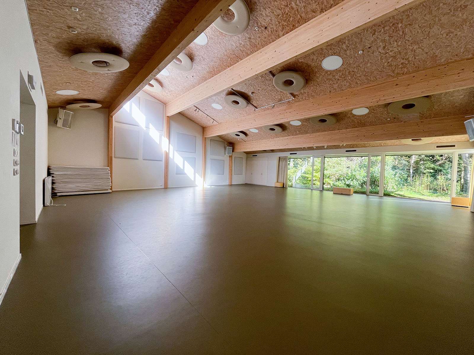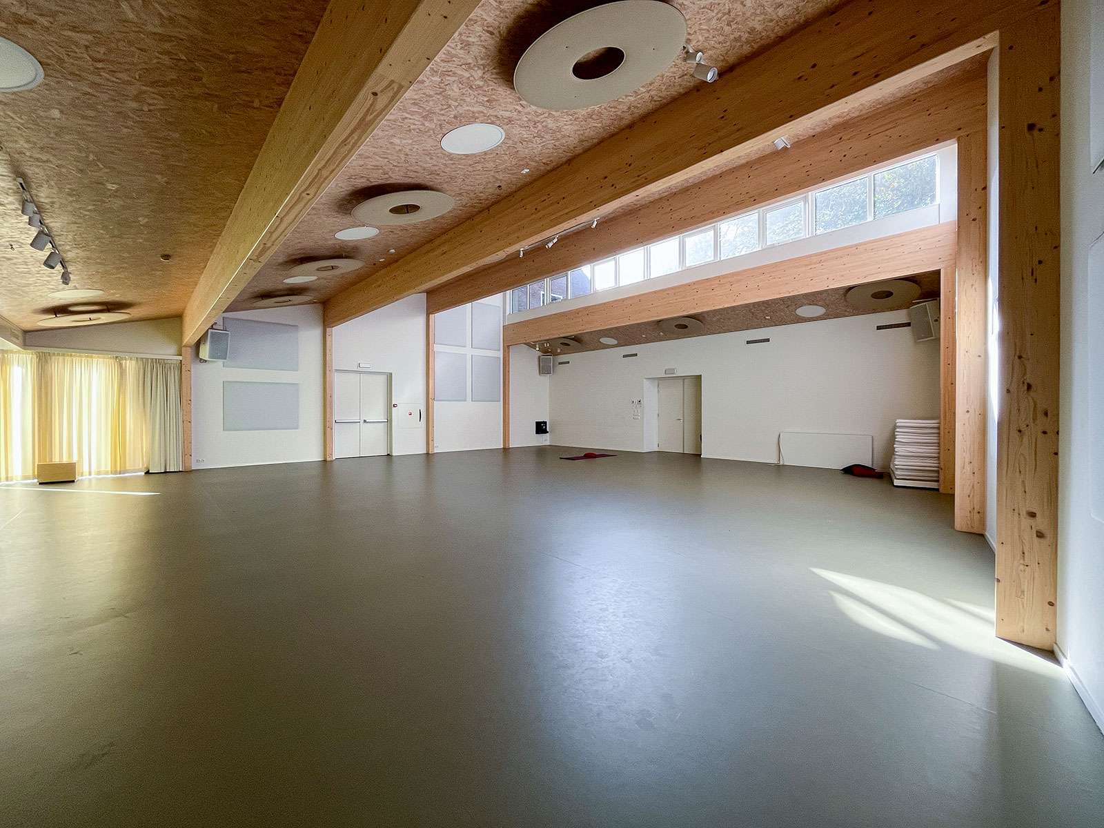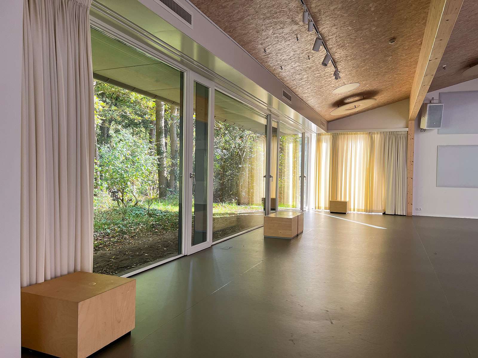 Deze bijzonder ruime en toch intieme zaal is voorzien van een geruisloze balansventilatie met uitsluitend frisse buitenlucht. Ook is er vloerverwarming en met een vernuftig verlichtingssysteem kunnen o.a. door kleurgebruik allerlei sferen worden opgeroepen. Ook het geluidssysteem is geavanceerd.